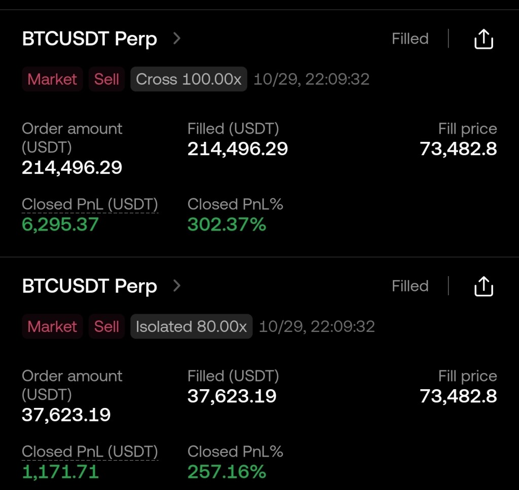 And it’s November 29, 2024, a week before the elections. I succumbed to greed. You know the reasons, of course. I’m desperate, very desperate. I need help. So I tried to increase my money… my goal was to make at least $10,000 the day before the election and enter long with 100x. That way, I would have opened a long trade with $1,000,000. Of course, I knew a big rise was coming. With $ 67,000, the rise started and it went up to about $ 100,000, that is, it increased by 50%. In a very short time. With 100x, I was hoping to make about $500,000. However, if I had left a balance of $5,000, I would have $250,000 more money now and I could go to the U.S. and build a life. This cost me a lot…