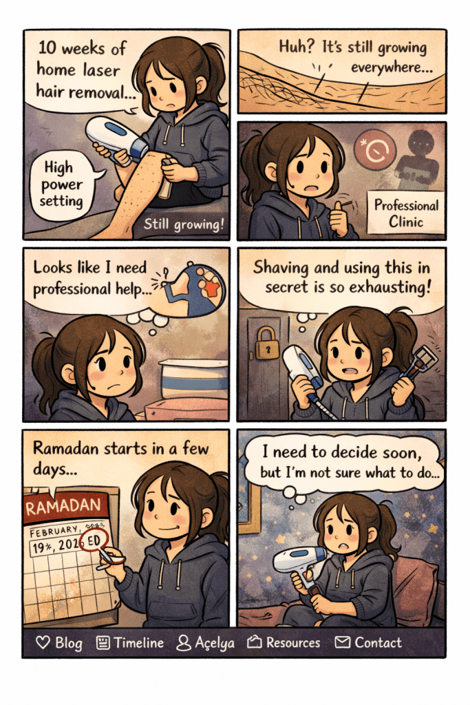 Ramadan will start in a few days. During that period, I could both control my weight and maybe get better results by doing laser hair removal every day.